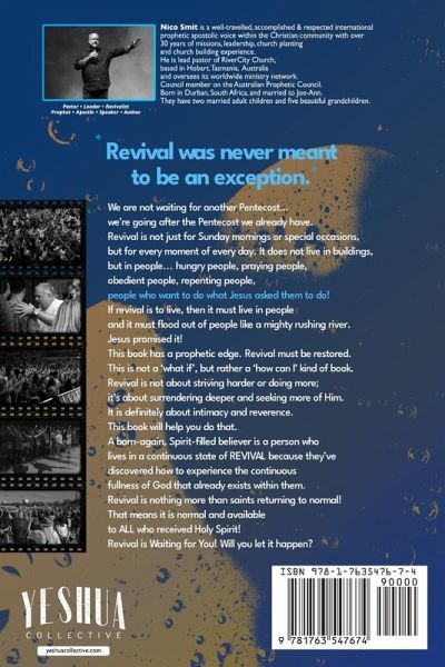 Revival was never meant to be an exception!... it's normal. What is revival? TO BE FULLY ALIVE IN CHRIST! Revival means to live 'AGAIN'. This book is for everyone! We are not waiting for another Pentecost... we're going after the Pentecost we already have. Revival is not just for Sunday mornings or special occasions, but for every moment of every day. It does not live in buildings, but in people... hungry people... praying people... obedient people... repenting people... people who want to do what Jesus asked them to do! If revival is to live, then it must live in people and it must flood out of people like a mighty rushing river. Jesus promised it! This book has a prophetic edge. Revival must be restored. This is not a 'what if', but rather a 'how can I' kind of book. Revival is not about striving harder or doing more; it's about surrendering deeper and seeking more of Him. It is definitely about intimacy and reverence. This book will help you do that. A born-again Spirit filled believer is person who lives in a continuous state of REVIVAL because they've discovered how to experience the continuous fullness of God that already exists within them. Revival is nothing more than saints returning to normal! That means it is normal and available to ALL who received Holy Spirit! Revival is Waiting for You! Will you let it happen?