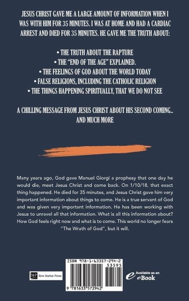 Jesus Christ gave me a large amount of information when I was with him for 35 minutes. I was at home and had a cardiac arrest and died for 35 minutes. He gave me the truth about: ¿ The truth about the rapture ¿ The "End of the Age" explained. ¿ The feelings of God about the world today ¿ False religions, including the Catholic Religion ¿ The things happening spiritually, that we do not see A chilling message from Jesus Christ about his second coming And Much More
