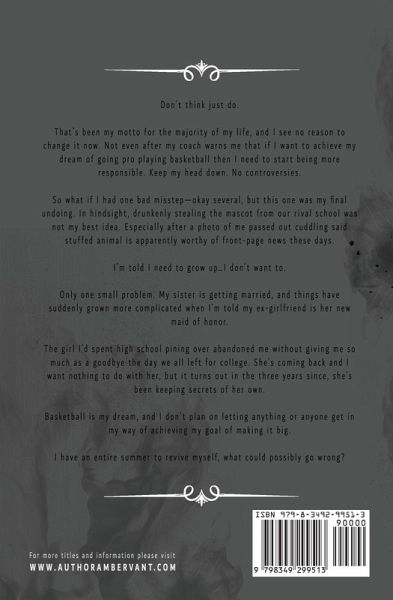 Don't think just do. That's been my motto for the majority of my life, and I see no reason to change it now. Not even after my coach warns me that if I want to achieve my dream of going pro playing basketball then I need to start being more responsible. Keep my head down. No controversies. So what if I had one bad misstep-okay several, but this one was my final undoing. In hindsight, drunkenly stealing the mascot from our rival school was not my best idea. Especially after a photo of me passed out cuddling said stuffed animal is apparently worthy of front-page news these days. I'm told I need to grow up...I don't want to. Only one small problem. My sister is getting married, and things have suddenly grown more complicated when I'm told my ex-girlfriend is her new maid of honor. The girl I'd spent high school pining over abandoned me without giving me so much as a goodbye the day we all left for college. She's coming back and I want nothing to do with her, but it turns out in the three years since, she's been keeping secrets of her own. Basketball is my dream, and I don't plan on letting anything or anyone get in my way of achieving my goal of making it big. I have an entire summer to revive myself, what could possibly go wrong?