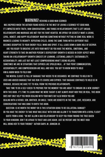 Reviving a Good Man Scorned was inspired by a relationship between two people who learned to love one another for who they were. They were able to recognize that women are not the only humans that operate out of hurt by displaying scorned tendencies. The author was able to see her man's pain and the actions he displayed due to fear of feeling or experiencing the same type of hurt. Once she figured out men can be scorned and not recognize it their journey became different. Before she could recognize it and cause a shift she had to first acknowledge if their was something in her that needed to be healed or revived. This book is impacted by words and insight from a man's view on women and relationships. It gives keys and acknowledge factors when it comes to self, love, and loving a man or woman. We must know no relationship is perfect and every stage of relationships requires putting in some work. Learning the importance of unconditional love with conditional boundaries, communication, comprehending, and accountability in the relationship with yourself and others will transform yourself and your relationships with others. It shed light on how they moved from fear due to past unhealthy, blindsided pain, and toxic relationships with red flags into a relationship filled with purple flags-- that brought healthy, love filled, new level of intimacy, growth induced, building together, and learning each other love language. The Author tells her story of witnessing her partner go from fear of loving and trusting again to becoming her King. Her partner tells his story about why he use to cheat, how he had to discover his worth, understand he is worthy to be loved, and love is a gift worth unwrapping daily. He goes on to speak about what it is like to have a powerful woman teaching him how to love by watching her love herself and him for who he was. Warning-- there are some raw discussions of sex and soul ties.