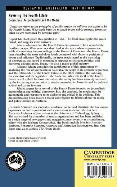 The news media is traditionally the watchdog of democracy. Today, it is also one of the most pervasive global industries. In this lively and accessible book, Schultz systematically analyses the role of journalism in Australia and the scope of its democratic purpose. She examines key news stories, and looks at the attitudes of Australian journalists themselves. The fourth estate remains the ideal of most journalists, but the reality has been impaired by the increasing concentration of media ownership and by political, ethical and occupational interests. While Australian journalism has become bolder and more investigative, increasing commercialism and decreasing ethical standards have left the public sceptical. Schultz argues for a revival of the fourth estate based on journalistic independence and poltical autonomy, together with increased accountability and responsiveness.