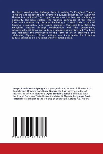 This book examines the challenges faced in reviving Tiv Kwagh-hir Theatre in Nigeria and its potential for promoting cultural exchange. Tiv Kwagh-hir Theatre is a traditional form of performance art that has been declining in popularity. The book explores the historical significance of this theatre form and identifies key obstacles hindering its revival, such as lack of funding, infrastructure, and trained personnel. Strategies to revitalize Tiv Kwagh-hir Theatre through collaboration with the government, educational institutions, and cultural organizations are discussed. The book also highlights the importance of this form of art in preserving and celebrating Nigerian cultural heritage, and its potential for fostering cultural exchange on a national and international scale.