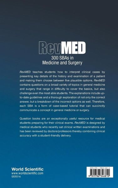 RevMED teaches students how to interpret clinical cases by presenting key details of the history and examination of a patient and making them choose between five plausible options. RevMED contains questions on a broad variety of topics in general medicine and surgery that range in difficulty to cover the basics, but also challenge even the most able students. The explanations include up-to-date guidelines and a thorough exploration of not only the correct answer, but a breakdown of the incorrect options as well. Therefore, each SBA is a form of case-based tutorial that can succinctly communicate a concept in general medicine or surgery. Question books are an exceptionally useful resource for medical students preparing for their clinical exams. RevMED is designed by medical students who recently sat clinical written examinations and has been reviewed by doctors/professors thereby combining clinical accuracy with a student-friendly delivery.