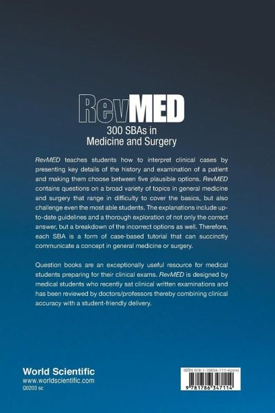 RevMED teaches students how to interpret clinical cases by presenting key details of the history and examination of a patient and making them choose between five plausible options. RevMED contains questions on a broad variety of topics in general medicine and surgery that range in difficulty to cover the basics, but also challenge even the most able students. The explanations include up-to-date guidelines and a thorough exploration of not only the correct answer, but a breakdown of the incorrect options as well. Therefore, each SBA is a form of case-based tutorial that can succinctly communicate a concept in general medicine or surgery. Question books are an exceptionally useful resource for medical students preparing for their clinical exams. RevMED is designed by medical students who recently sat clinical written examinations and has been reviewed by doctors/professors thereby combining clinical accuracy with a student-friendly delivery.