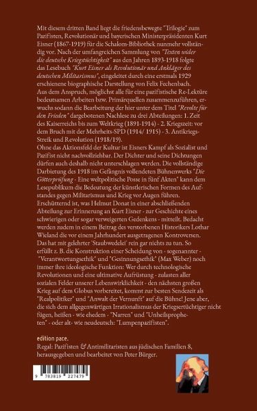 Mit diesem dritten Band liegt die friedensbewegte "Trilogie" zum Pazifisten, Revolutionär und bayerischen Ministerpräsidenten Kurt Eisner (1867-1919) für die Schalom-Bibliothek nunmehr vollständig vor. Nach der umfangreichen Sammlung von "Texten wider die deutsche Kriegstüchtigkeit" aus den Jahren 1893-1918 folgte das Lesebuch "Kurt Eisner als Revolutionär und Ankläger des deutschen Militarismus", eingeleitet durch eine erstmals 1929 erschienene biographische Darstellung von Felix Fechenbach. Aus dem Anspruch, möglichst alle für eine pazifistische Re-Lektüre bedeutsamen Arbeiten bzw. Primärquellen zusammenzuführen, erwuchs sodann die Bearbeitung der hier unter dem Titel "Revolte für den Frieden" dargebotenen Nachlese zu drei Abteilungen: 1. Zeit des Kaiserreichs bis zum Weltkrieg (1891-1914) - 2. Kriegszeit: vor dem Bruch mit der Mehrheits-SPD (1914/1915) - 3. Antikriegs-Streik und Revolution (1918/19). Ohne das Aktionsfeld der Kultur ist Eisners Kampf als Sozialist und Pazifist nicht nachvollziehbar. Der Dichter und seine Dichtungen dürfen auch deshalb nicht unterschlagen werden. Die vollständige Darbietung des 1918 im Gefängnis vollendeten Bühnenwerks "Die Götterprüfung - Eine weltpolitische Posse in fünf Akten" soll dem Lesepublikum die Bedeutung der künstlerischen Formen des Aufstandes gegen Militarismus und Krieg vor Augen führen. Erschütternd ist, was Helmut Donat in einer abschließenden Abteilung zur Erinnerung an Kurt Eisner - zur Geschichte eines schwierigen oder sogar verweigerten Gedenkens - mitteilt. Bedacht werden zudem in einem Beitrag des verstorbenen Historikers Lothar Wieland die vor einem Jahrhundert ausgetragenen Kontroversen. Das hat mit gelehrter Staubwedelei rein gar nichts zu tun. So erfüllt z.B. die Konstruktion einer Scheidung von sogenannter "Verantwortungsethik" und "Gesinnungsethik" (Max Weber) noch immer ihre ideologische Funktion: Wer durch technologische Revolutionen und eine ultimative Aufrüstung - zulasten aller sozialen Felder unserer Lebenswirklichkeit - den nächsten großen Krieg auf dem Globus vorbereitet, kommt zur besten Sendezeit als "Realpolitiker" und "Anwalt der Vernunft" auf die Bühne! Jene aber, die sich dem allgegenwärtigen Irrationalismus der Kriegsertüchtiger nicht fügen, heißen - wie ehedem - "Narren" und "Unheilspropheten" - oder alt- wie neudeutsch: "Lumpenpazifisten". edition pace. Regal: Pazifisten & Antimilitaristen aus jüdischen Familien 8, herausgegeben und bearbeitet von Peter Bürger.