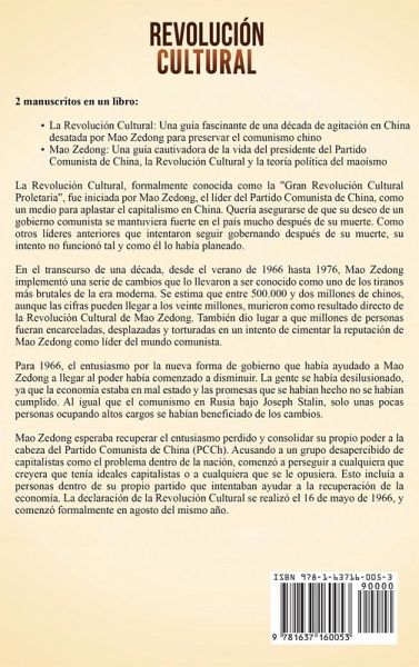 2 manuscritos completos en 1 libroLa Revolución Cultural: Una guía fascinante de una década de agitación en China desatada por Mao Zedong para preservar el comunismo chino Mao Zedong: Una guía cautivadora de la vida del presidente del Partido Comunista de China, la Revolución Cultural y la teoría política del maoísmo La Revolución Cultural, conocida en su totalidad como la "Gran Revolución Cultural Proletaria", fue lanzada por Mao Zedong, el líder del Partido Comunista de China, como un medio para aplastar el capitalismo en China. Quería asegurarse de que su deseo de un gobierno comunista se mantuviera fuerte en el país mucho después de su muerte. Como otros líderes anteriores que intentaron seguir gobernando después de su muerte, su intento no funcionó tal y como él lo había planeado. En el transcurso de una década, desde el verano de 1966 hasta 1976, Mao Zedong implementó una serie de cambios que lo llevaron a ser conocido como uno de los tiranos más brutales de la era moderna. Se estima que entre 500.000 y dos millones de chinos, aunque las cifras pueden llegar a los veinte millones, murieron como resultado directo de la Revolución Cultural de Zedong. También dio lugar a que millones de personas fueran encarceladas, desplazadas y torturadas en un intento de cimentar la reputación de Mao Zedong como líder del mundo comunista. La primera parte de este libro incluye:Los comienzos de la vida de Mao Zedong, el ascenso al poder y la agitación del gobierno que cambió a China durante la primera mitad del siglo XX La sospecha detrás del rostro unido El Plan Quinquenal, el Gran Salto Adelante, y los eventos que llevaron a la Revolución Cultural luchando contra el capitalismo de Occidente La introducción de la revolución Los Guardias Rojos El incidente del 20 de julio Los enfrentamientos fronterizos con los soviéticos comunistas Lin Biao - El sucesor y oponente Asesinatos en masa en China y devastación en el norte de China El fin de la Revolución Cultural Efectos duraderos ¡Y mucho, mucho más! Segunda parte de este libro, usted:Primeros años Despertar político Pekín Cuatro de mayo y el Movimiento de la Nueva Cultura Los dolores de crecimiento del Partido Comunista de China La Expedición del Norte Crecimiento de su popularidad y apoyo de las masas La Gran Marcha La República Popular China El Gran Salto Adelante La Revolución Cultural ¿Qué representó el maoísmo? ¡Y mucho más! ¡Consiga este libro ahora para aprender más sobre la revolución cultural y Mao Zedong!