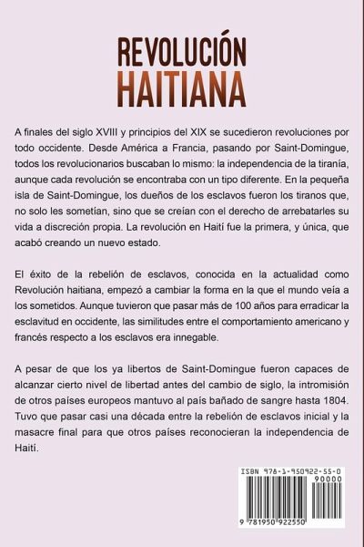 Explore cómo se liberaron los esclavos en la Revolución haitiana La Revolución haitiana fue una rebelión de esclavos que comenzó en 1791 en la colonia francesa de Saint-Domingue, conocida ahora como Haití. En esta pequeña isla los tiranos fueron los dueños de esclavos, gente que no solo privaba de libertad a sus esclavos, sino que también pensaba que estaba justificado quitarles la vida. La Revolución haitiana empezó a cambiar la imagen de los esclavos en el mundo. Aunque costó otros 100 años erradicar la esclavitud en occidente, era imposible ignorar el paralelismo entre lo que los americanos y los franceses hicieron a los esclavos. La Revolución haitiana fue el primer y único caso en el que una rebelión de esclavos desembocó en la creación de un nuevo estado. Algunos de los temas incluidos en este libro son: La riqueza de Saint-Domingue El principio del fin de la colonia francesa Comienza la revolución La revolución se extiende Cúmulo de eventos en Europa La abolición de la esclavitud y la respuesta británica La llegada al poder de Toussaint Louverture La derrota de Inglaterra y el respeto internacional El ascenso de Napoleón y su efecto inicial en Saint-Domingue El fin de la revolución Efectos duraderos - Más allá de la isla Haití en la actualidad Haiti Today ¡Y mucho más! ¡Consiga su libro ahora para aprender sobre la Revolución haitiana!