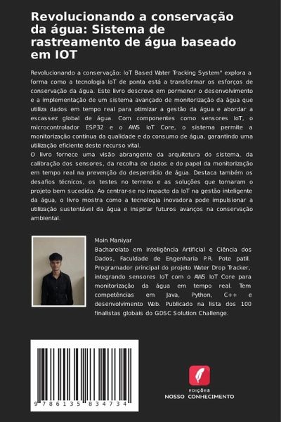 Revolucionando a conservação: IoT Based Water Tracking System" explora a forma como a tecnologia IoT de ponta está a transformar os esforços de conservação da água. Este livro descreve em pormenor o desenvolvimento e a implementação de um sistema avançado de monitorização da água que utiliza dados em tempo real para otimizar a gestão da água e abordar a escassez global de água. Com componentes como sensores IoT, o microcontrolador ESP32 e o AWS IoT Core, o sistema permite a monitorização contínua da qualidade e do consumo de água, garantindo uma utilização eficiente deste recurso vital.O livro fornece uma visão abrangente da arquitetura do sistema, da calibração dos sensores, da recolha de dados e do papel da monitorização em tempo real na prevenção do desperdício de água. Destaca também os desafios técnicos, os testes no terreno e as soluções que tornaram o projeto bem sucedido. Ao centrar-se no impacto da IoT na gestão inteligente da água, o livro mostra como a tecnologia inovadora pode impulsionar a utilização sustentável da água e inspirar futuros avanços na conservação ambiental.