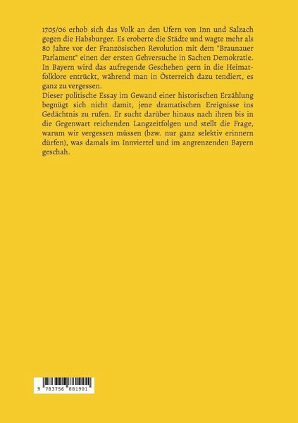 1705/06 erhob sich das Volk an den Ufern von Inn und Salzach gegen die Habsburger. Es eroberte die Städte und wagte mehr als 80 Jahre vor der Französischen Revolution mit dem "Braunauer Parlament" einen der ersten Gehversuche in Sachen Demokratie. In Bayern wird dieses aufregende Geschehen gern in die Heimatfolklore entrückt, während man in Österreich dazu tendiert, es ganz zu vergessen.Dieser politische Essay im Gewand einer historischen Erzählung begnügt sich nicht damit, jene dramatischen Ereignisse ins Gedächtnis zu rufen. Er sucht darüber hinaus nach ihren bis in die Gegenwart reichenden Langzeitfolgen und stellt die Frage, warum wir vergessen müssen (bzw. nur ganz selektiv erinnern dürfen), was damals im Innviertel und im angrenzenden Bayern geschah.