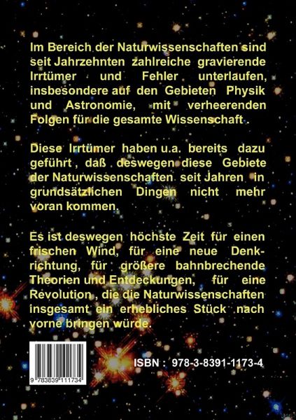 Im Bereich der Naturwissenschaften sind seit Jahrzehnten zahlreiche gravierende Irrtümer und Fehler unterlaufen, insbesondere auf den Gebieten Physik und Astronomie, mit verheerenden Folgen für die gesamte Wissenschaft. Diese Irrtümer haben u.a. bereits dazu geführt, daß deswegen diese Gebiete der Naturwissenschaften seit Jahren in grundsätzlichen Dingen nicht mehr voran kommen.Es ist deswegen höchste Zeit für einen frischen Wind, für eine neue Denkrichtung, für größere bahnbrechende Theorien und Entdeckungen, für eine Revolution, die die Naturwissenschaften insgesamt ein erhebliches Stück nach vorne bringen würde.