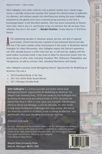 After decades of suburban sprawl, job loss, and lack of regional government, Detroit has become a symbol of post-industrial distress and also one of the most complex urban environments in the world. In Revolution Detroit: Strategies for Urban Reinvention, John Gallagher argues that Detroit's experience can offer valuable lessons to other cities that are, or will soon be, dealing with the same broken municipal model. A follow-up to his award-winning 2010 work, Reimagining Detroit, this volume looks at Detroit's successes and failures in confronting its considerable challenges. It also looks at other ideas for reinvention drawn from the recent history of other cities, including Cleveland, Flint, Richmond, Philadelphia, and Youngstown, as well as overseas cities, including Manchester and Leipzig. Revolution Detroit surveys four key areas: governance, education and crime, economic models, and the repurposing of vacant urban land. Among the topics Gallagher covers are effective new urban governance models developed in Cleveland and Detroit; new education models highlighting low-income-but-high-achievement schools and districts; creative new entrepreneurial business models emerging in Detroit and other post-industrial cities; and examples of successful repurposing of vacant urban land through urban agriculture, restoration of natural landscapes, and the use of art in public places. He concludes with a cautious yet hopeful message that Detroit may prove to be the world's most important venue for successful urban experimentation and that the reinvention portrayed in the book can be repeated in many cities. Gallagher's extensive traveling and research, along with his long career covering urban redevelopment for the Detroit Free Press, has given him an unmatched perspective on Detroit's story. Readers interested in urban studies and recent Detroit history will appreciate this thoughtful assessment of the best practices and obvious errors when it comes to reinventing our cities.