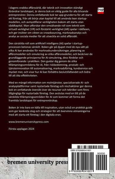 I dagens snabba affärsvärld, där teknik och innovation ständigt förändrar landskapet, är denna bok en viktig guide för alla blivande entreprenörer. Denna omfattande bok tar upp grunderna för att starta ett företag, från att börja utan kapital till att använda lean startup-modellen, och avmystifierar verkligheten bakom att starta utan såddkapital. Man utforskar den omvälvande roll som teknik som virtuell verklighet (VR) och förstärkt verklighet (AR) spelar i idéfasen, och ger insikter om vikten av crowdsourcing, marknadsanalys och analys av sociala medier för att utveckla en solid affärsidé. Den särskilda roll som artificiell intelligens (AI) spelar i startup-processen betonas särskilt. Boken går på djupet med de nya sätt på vilka AI kan användas för marknadsundersökningar, planering av affärsmodeller och simulering av olika affärsmodeller, och beskriver de grundläggande principerna för AI-simulering, dess fördelar och genomförande i praktiken. Den guidar dig genom de olika tillämpningsområdena för AI, från riskbedömning, produkt- och tjänsteinnovation till automatisering, marknadsföring, kundservice och mycket mer, och visar hur AI kan förbättra beslutsfattandet och bidra till att öka effektiviteten. Med en mängd information om molntjänster, specialiserade AI- och analysplattformar samt nystartade företag och nischaktörer ger denna bok en omfattande översikt över de resurser och tekniker som finns tillgängliga för nystartade företag. Den avslutas med en titt på de särskilda tillämpningsområden för AI som kommer att forma det framtida landskapet för entreprenörskap. Boken är inte bara en källa till inspiration, utan också en praktisk guide som ger konkreta steg och strategier för att övervinna utmaningarna med att starta ett företag i den digitala eran.