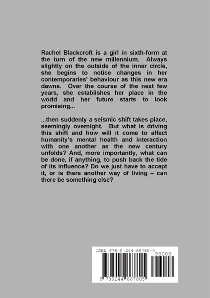 Rachel Blackcroft is a girl in sixth-form at the turn of the new millennium. Always slightly on the outside of the inner circle, she begins to notice changes in her contemporaries' behaviour as this new era dawns. Over the course of the next few years, she establishes her place in the world and her future starts to look promising... ...then suddenly a seismic shift takes place, seemingly overnight. But what is driving this shift and how will it come to affect humanity's mental health and interaction with one another as the new century unfolds? And, more importantly, what can be done, if anything, to push back the tide of its influence? Do we just have to accept it, or is there another way of living - can there be something else?