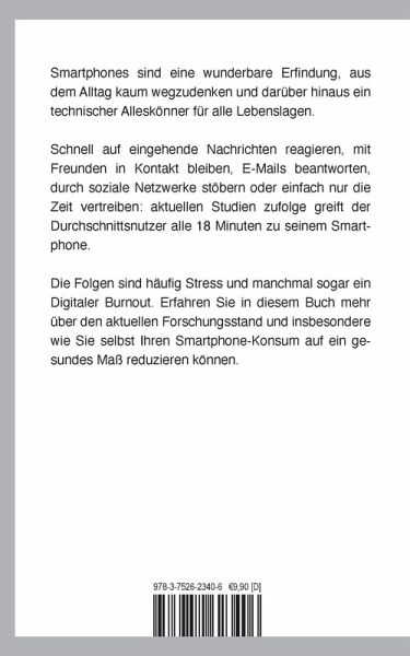 Smartphones sind eine wunderbare Erfindung, aus dem Alltag kaum wegzudenken und darüber hinaus ein technischer Alleskönner für alle Lebenslagen. Schnell auf eingehende Nachrichten reagieren, mit Freunden in Kontakt bleiben, E-Mails beantworten, durch soziale Netzwerke stöbern oder einfach nur die Zeit vertreiben: aktuellen Studien zufolge greift der Durchschnittsnutzer alle 18 Minuten zu seinem Smartphone. Die Folgen sind häufig Stress und manchmal sogar ein Digitaler Burnout. Erfahren Sie in diesem Buch mehr über den aktuellen Forschungsstand und insbesondere wie Sie selbst Ihren Smartphone-Konsum auf ein gesundes Maß reduzieren können.