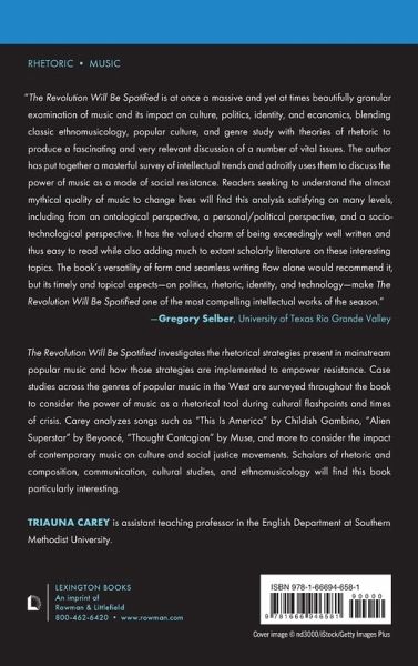 The Revolution Will Be Spotified investigates the rhetorical strategies present in mainstream popular music and how those strategies are implemented to empower resistance. Case studies across the genres of popular music in the West are surveyed throughout the book to consider the power of music as a rhetorical tool during cultural flashpoints and times of crisis. Carey analyzes songs such as "This is America" by Childish Gambino, "Alien Superstar" by Beyoncé, "Thought Contagion" by Muse, and more to consider the impact of contemporary music on culture and social justice movements. Scholars of rhetoric and composition, communication, cultural studies, and ethnomusicology will find this book particularly interesting.