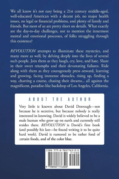We all know it's not easy being a 21st century middle-aged, well-educated American with a decent job, no major health issues, no legal or financial problems, and plenty of family and friends. But most of us are pretty short on details. What exactly are the day-to-day challenges, not to mention the innermost mental and emotional processes, of folks struggling through this existence? REVOLUTION attempts to illuminate these mysteries, and many more as well, by delving deeply into the lives of several such people. Join them as they laugh, cry, love, and hate. Share in their sweet triumphs and their devastating failures. Ride along with them as they courageously press onward, learning and growing, facing immense obstacles, rising up, finding a way, charting a course, chasing their dreams... all against the magnificent, paradise-like backdrop of Los Angeles, California. For additional sarcasm and cynicism, as well as jokes and nonsense and excerpts from the book: https://revolutionnovel.com