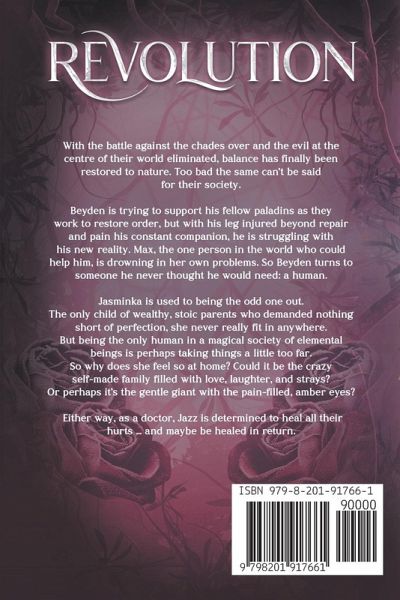 Opposites attract. Age gap. Hurt/comfort. Doctor/patient. With the battle against the chades over, and the evil at the centre of their world eliminated, balance has finally been restored to nature. Too bad the same can't be said for their society. Beyden is trying to support his fellow paladins as they work to restore order after the upheaval caused by the Revolution. But with his leg injured beyond repair and pain his constant companion, Beyden is struggling with his new reality. Max, the one person in the world who could possibly help him, is drowning in her own problems. So Beyden turns to someone he never thought he would need, a human. Jasminka is used to being the odd one out. The only child of wealthy, stoic parents who demanded nothing short of perfection, she never really fit in anywhere. But being the only human in a magical society of elemental beings and modern-day knights is perhaps taking things a little too far. So why does she feel so at home? Could it be the crazy self-made family, filled with love, laughter, and strays? Or perhaps it's the gentle giant with the pain-filled, amber eyes? Either way, as a doctor, Jasminka is determined to heal all their hurts ... and just maybe, be healed in return.