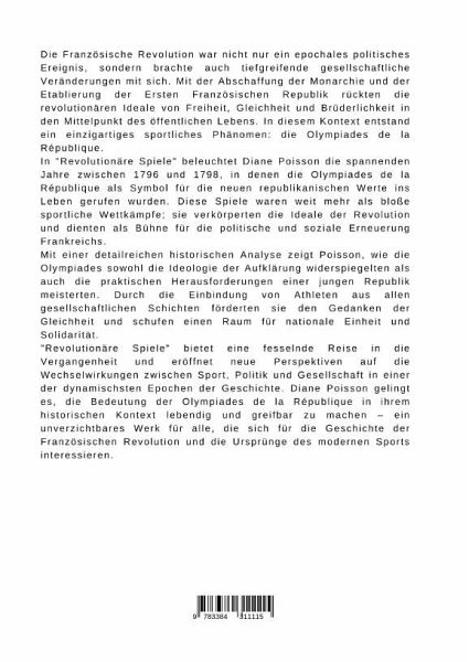 Die Französische Revolution war nicht nur ein epochales politisches Ereignis, sondern brachte auch tiefgreifende gesellschaftliche Veränderungen mit sich. Mit der Abschaffung der Monarchie und der Etablierung der Ersten Französischen Republik rückten die revolutionären Ideale von Freiheit, Gleichheit und Brüderlichkeit in den Mittelpunkt des öffentlichen Lebens. In diesem Kontext entstand ein einzigartiges sportliches Phänomen: die Olympiades de la République.In "Revolutionäre Spiele" beleuchtet Diane Poisson die spannenden Jahre zwischen 1796 und 1798, in denen die Olympiades de la République als Symbol für die neuen republikanischen Werte ins Leben gerufen wurden. Diese Spiele waren weit mehr als bloße sportliche Wettkämpfe; sie verkörperten die Ideale der Revolution und dienten als Bühne für die politische und soziale Erneuerung Frankreichs.Mit einer detailreichen historischen Analyse zeigt Poisson, wie die Olympiades sowohl die Ideologie der Aufklärung widerspiegelten als auch die praktischen Herausforderungen einer jungen Republik meisterten. Durch die Einbindung von Athleten aus allen gesellschaftlichen Schichten förderten sie den Gedanken der Gleichheit und schufen einen Raum für nationale Einheit und Solidarität."Revolutionäre Spiele" bietet eine fesselnde Reise in die Vergangenheit und eröffnet neue Perspektiven auf die Wechselwirkungen zwischen Sport, Politik und Gesellschaft in einer der dynamischsten Epochen der Geschichte. Diane Poisson gelingt es, die Bedeutung der Olympiades de la République in ihrem historischen Kontext lebendig und greifbar zu machen - ein unverzichtbares Werk für alle, die sich für die Geschichte der Französischen Revolution und die Ursprünge des modernen Sports interessieren.