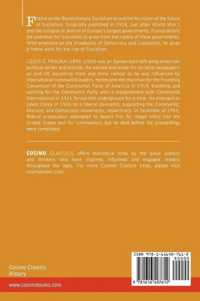 Fraina wrote Revolutionary Socialism to outline his vision of the future of Socialism. Originally published in 1918, just after World War I and the collapse of several of Europe's largest governments, Fraina details the potential for Socialism to grow from the rubble of these governments. With emphasis on the drawbacks of Democracy and Capitalism, he gives a frame work for the rise of Socialism. LOUIS C. FRAINA (1892-1953) was an Italian-born left-wing American political writer and activist. He worked and wrote for socialist newspapers on and off, becoming more and more radical as he was influenced by international communist leaders. He became the chairman for the Founding Convention of the Communist Party of America in 1919, traveling and working for the Communist Party until a disagreement with Communist International in 1921 forced him underground for a time. He emerged as Lewis Corey in 1926 as a liberal journalist, supporting the Communist, Marxist, and Democratic movements, respectively. In December of 1950, federal prosecutors attempted to deport him for illegal entry into the United States and for communism, but he died before the proceedings were completed.