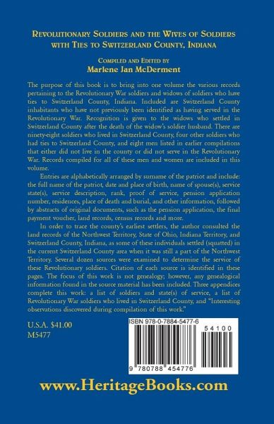 The purpose of this book is to bring into one volume the various records pertaining to the Revolutionary War soldiers and widows of soldiers who have ties to Switzerland County, Indiana. Included are Switzerland County inhabitants who have not previously been identified as having served in the Revolutionary War. Recognition is given to the widows who settled in Switzerland County after the death of the widow's soldier husband. There are ninety-eight soldiers who lived in Switzerland County, four other soldiers who had ties to Switzerland County, and eight men listed in earlier compilations that either did not live in the county or did not serve in the Revolutionary War. Records compiled for all of these men and women are included in this volume. Entries are alphabetically arranged by surname of the patriot and include: the full name of the patriot, date and place of birth, name of spouse(s), service state(s), service description, rank, proof of service, pension application number, residences, place of death and burial, and other information, followed by abstracts of original documents, such as the pension application, the final payment voucher, land records, census records and more. In order to trace the county's earliest settlers, the author consulted the land records of the Northwest Territory, State of Ohio, Indiana Territory, and Switzerland County, Indiana, as some of these individuals settled (squatted) in the current Switzerland County area when it was still a part of the Northwest Territory. Several dozen sources were examined to determine the service of these Revolutionary soldiers. Citation of each source is identified in these pages. The focus of this work is not genealogy; however, any genealogical information found in the source material has been included. Three appendices complete this work: a list of soldiers and state(s) of service, a list of Revolutionary War soldiers who lived in Switzerland County, and "Interesting observations discovered during compilation of this work."