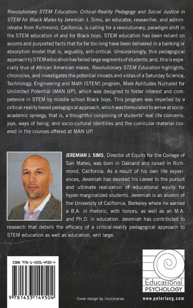 Revolutionary STEM Education: Critical-Reality Pedagogy and Social Justice in STEM for Black Males by Jeremiah J. Sims, an educator, researcher, and administrator from Richmond, California, is calling for a revolutionary, paradigm shift in the STEM education of and for Black boys. STEM education has been reliant on axioms and purported facts that for far too long have been delivered in a banking or absorption model that is, arguably, anti-critical. Unsurprisingly, this pedagogical approach to STEM education has failed large segments of students; and, this is especially true of African American males. Revolutionary STEM Education highlights, chronicles, and investigates the potential inroads and vistas of a Saturday Science, Technology, Engineering and Math (STEM) program, Male Aptitudes Nurtured for Unlimited Potential (MAN UP), which was designed to foster interest and competence in STEM by middle school Black boys. This program was impelled by a critical-reality based pedagogical approach, which was formulated to arrive at socio-academic synergy, that is, a thoughtful conjoining of students' real life concerns, joys, ways of being, and socio-cultural identities and the curricular material covered in the courses offered at MAN UP.