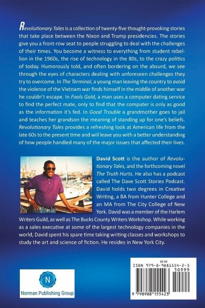 Revolutionary Tales" is a collection of twenty-five thought-provoking stories that take place between the Nixon and Trump presidencies. The stories give you a front-row seat to people struggling to deal with the challenges of their times. You become a witness to everything from student rebellion in the 1960s, the rise of technology in the 80s, to the crazy politics of today. Humorously told and often bordering on the absurd, we see through the eyes of characters dealing with unforeseen challenges they try to overcome. In "The Terminal," a young man leaving the country to avoid the violence of the Vietnam War finds himself in the middle of another war he couldn't escape. In "Fools Gold." a man uses a computer dating service to find the perfect mate, only to find that the computer is only as good as the information it's fed. In "Good Trouble," a grandmother goes to jail and teaches her grandson the meaning of standing up for one's beliefs. "Revolutionary Tales" provides a refreshing look at American life from the late 60s to the present and will leave you with a better understanding of how people handled many of the major issues that affected their lives.