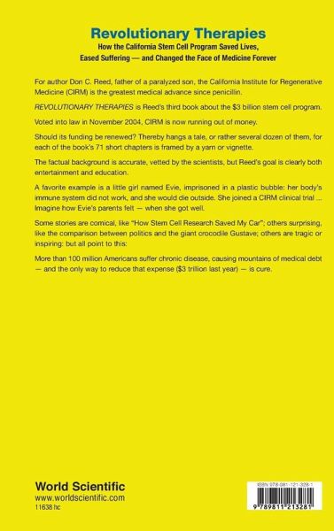 For author Don C Reed, father of a paralyzed son, the California Institute for Regenerative Medicine (CIRM) is the greatest medical advance since penicillin. REVOLUTIONARY THERAPIES is Reed's third book about the $3 billion stem cell program. Voted into law in November 2004, CIRM is now running out of money. Should its funding be renewed? Thereby hangs a tale, or rather several dozen of them, for each of the book's 71 short chapters is framed by a yarn or vignette. The factual background is accurate, vetted by the scientists, but Reed's goal is clearly both entertainment and education. A favorite example is a little girl named Evie, imprisoned in a plastic bubble: her body's immune system did not work, and she would die outside. She joined a CIRM clinical trial ... Imagine how Evie's parents felt - when she got well. Some stories are comical, like ""How Stem Cell Research Saved My Car""; others surprising, like the comparison between politics and the giant crocodile Gustave; others are tragic or inspiring: but all point to this: More than 100 million Americans suffer chronic disease, causing mountains of medical debt - and the only way to reduce that expense ($3 trillion last year) - is cure.
