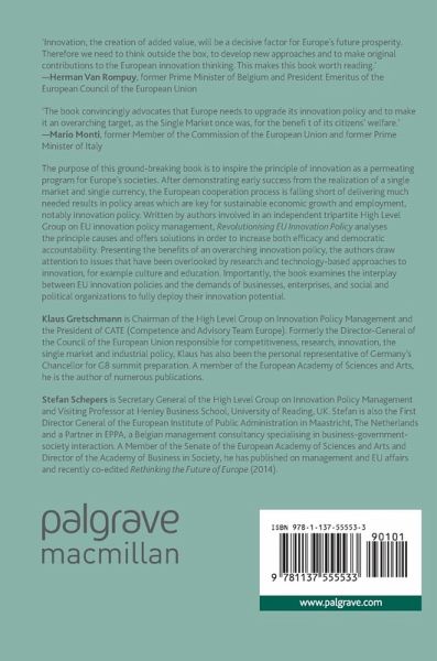 The purpose of this ground-breaking book is to inspire the principle of innovation as a permeating program for Europe's societies. After demonstrating early success from the realization of a single market and single currency, the European cooperation process is falling short of delivering much needed results in policy areas which are key for sustainable economic growth and employment, notably innovation policy. Written by authors involved in an independent tripartite High Level Group on EU innovation policy management, Revolutionising EU Innovation Policy analyses the principle causes and offers solutions in order to increase both efficacy and democratic accountability. Presenting the benefits of an overarching innovation policy, the authors draw attention to issues that have been overlooked by research and technology based approaches to innovation, for example culture and education. Importantly, the book examines the interplay between EU innovation policies and the demands of businesses, enterprises, and social and political organizations to fully deploy their innovation potential.