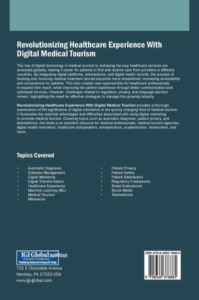 The rise of digital technology in medical tourism is reshaping the way healthcare services are accessed globally, making it easier for patients to find and receive care from providers in different countries. By integrating digital platforms, telemedicine, and digital health records, the process of booking and receiving medical treatment abroad becomes more streamlined, increasing accessibility and convenience for patients. This also creates new opportunities for healthcare professionals to expand their reach, while improving the patient experience through better communication and optimized services. However, challenges related to regulation, privacy, and language barriers remain, highlighting the need for effective strategies to manage this growing industry. Revolutionizing Healthcare Experience With Digital Medical Tourism provides a thorough examination of the significance of digital orientation in the quickly changing field of medical tourism. It illuminates the potential advantages and difficulties associated with using digital marketing to promote medical tourism. Covering topics such as automatic diagnosis, patient privacy, and telemedicine, this book is an excellent resource for medical professionals, medical tourism agencies, digital health innovators, healthcare policymakers, entrepreneurs, academicians, researchers, and more.