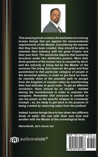 This amazing book contains the bad behaviors among human beings that are against the transcendental requirements of the Master. Considering the manner that they have been created, they should be able to maintain their intimacy with the great Creator and their own kind. The worldview depicts that humanity functions under two distinctive powers. More than three quarters of the human race is usurped by devil, and the minority is being led by the Master of the universe. The living God reserves the great and final punishment to that particular category of people in the terrestrial sphere; in order to get back on track, he reminds them of the possible path to escape from the kingdom of usurper satan by transforming their bad attitudes to good ones. To get an effective revolution: there should be no double - minded among the revolutionists in order to maintain the conquest. Remember that everyone is entitled to use his power as the specific weapon to constantly triumph ; so, be ready to get back to the purpose of being created by removing satan from the podium! Indeed, human beings have to tear down two different kinds of walls: the one with their own kind and another with the Master of the cosmological facts. Henceforth, let's move on!