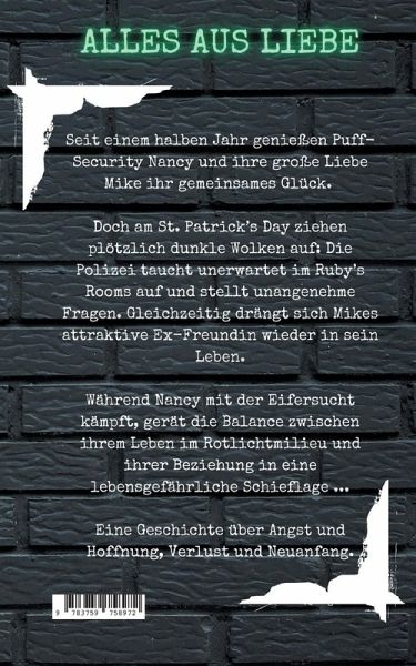Die Fortsetzung zu "Revolver im Strumpfband: u.a. ein Liebesroman"!Seit einem halben Jahr genießen Puff-Security Nancy und ihre große Liebe Mike ihr gemeinsames Glück. Doch am St. Patrick's Day ziehen plötzlich dunkle Wolken auf: Die Polizei taucht unerwartet im Ruby's Rooms auf und stellt unangenehme Fragen. Gleichzeitig drängt sich Mikes attraktive Ex-Freundin wieder in sein Leben.Während Nancy gegen die Eifersucht ankämpft, gerät die Balance zwischen ihrem Leben im Rotlichtmilieu und ihrer Beziehung in eine lebensgefährliche Schieflage. Eine Geschichte über Angst und Hoffnung, Verlust und Neuanfang.