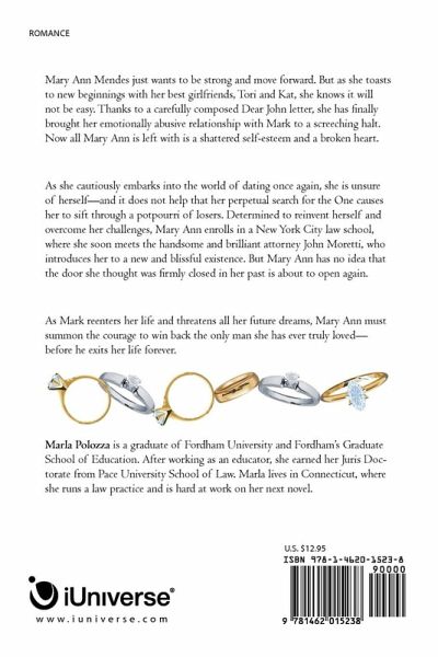 Mary Ann Mendes just wants to be strong and move forward. But as she toasts to new beginnings with her best girlfriends, Tori and Kat, she knows it will not be easy. Thanks to a carefully composed Dear John letter, she has finally brought her emotionally abusive relationship with Mark to a screeching halt. Now all Mary Ann is left with is a shattered self-esteem and a broken heart. As she cautiously embarks into the world of dating once again, she is unsure of herself-and it does not help that her perpetual search for the One causes her to sift through a potpourri of losers. Determined to reinvent herself and overcome her challenges, Mary Ann enrolls in a New York City law school, where she soon meets the handsome and brilliant attorney John Moretti, who introduces her to a new and blissful existence. But Mary Ann has no idea that the door she thought was firmly closed in her past is about to open again. As Mark reenters her life and threatens all her future dreams, Mary Ann must summon the courage to win back the only man she has ever truly loved-before he exits her life forever.