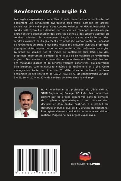 Les argiles expansives compactées à forte teneur en montmorillonite ont également une conductivité hydraulique très faible. Lorsque les argiles expansives sont mélangées à des cendres volantes, un déchet industriel, la conductivité hydraulique diminue encore, car les mélanges cendres-argile entraînent une augmentation des densités sèches à des teneurs accrues en cendres volantes. Par conséquent, l'argile expansive stabilisée par des cendres volantes peut également être proposée comme matériau innovant de revêtement en argile. Il est donc nécessaire d'étudier diverses propriétés physiques et techniques de ce nouveau matériau de revêtement en argile. La limite de liquidité (LL) et l'indice de gonflement libre (FSI) sont des propriétés importantes à étudier dans le cas de ce matériau de revêtement argileux. Des études expérimentales en laboratoire ont été réalisées sur des mélanges d'argile et de cendres volantes expansives, qui pourraient être proposés comme nouveau matériau de revêtement en argile. Cette monographie traite du LL et du FSI déterminés en utilisant de l'eau désionisée et des solutions de CaCl2, NaCl et KCl de concentration variable à 0 %, 10 %, 20 % et 30 % de cendres volantes dans le mélange.