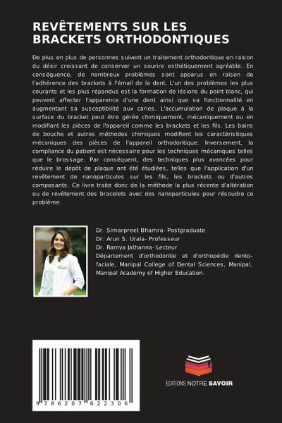 De plus en plus de personnes suivent un traitement orthodontique en raison du désir croissant de conserver un sourire esthétiquement agréable. En conséquence, de nombreux problèmes sont apparus en raison de l'adhérence des brackets à l'émail de la dent. L'un des problèmes les plus courants et les plus répandus est la formation de lésions du point blanc, qui peuvent affecter l'apparence d'une dent ainsi que sa fonctionnalité en augmentant sa susceptibilité aux caries. L'accumulation de plaque à la surface du bracket peut être gérée chimiquement, mécaniquement ou en modifiant les pièces de l'appareil comme les brackets et les fils. Les bains de bouche et autres méthodes chimiques modifient les caractéristiques mécaniques des pièces de l'appareil orthodontique. Inversement, la compliance du patient est nécessaire pour les techniques mécaniques telles que le brossage. Par conséquent, des techniques plus avancées pour réduire le dépôt de plaque ont été étudiées, telles que l'application d'un revêtement de nanoparticules sur les fils, les brackets ou d'autres composants. Ce livre traite donc de la méthode la plus récente d'altération ou de revêtement des bracelets avec des nanoparticules pour résoudre ce problème.