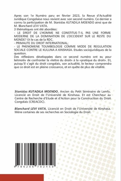 Apres son 1e Numéro paru en février 2023, la Revue d'Actualité Juridique Congolaise nous revient avec son second numéro. Ce dernier a connu la participation de M. Stanislas KUTADILA MOENDO ainsi que de M. Blanchard LEVI VATA.3 thématiques ont été abordées:- LE DROIT DE L'HOMME NE CONSTITUE-T-IL PAS UNE FORME MODERNE DE LA DOMINATION DE L'OCCIDENT SUR LE RESTE DU MONDE? Et le cas de la RDC.- PRIMAUTE DU DROIT INTERNATIONAL;- LE PHENOMENE TOUMBOLOGIE COMME MODE DE REGULATION SOCIALE CONTRE LE KULUNA A KINSHASA. Etudes sociojuridiques de la question.Des réflexions développées dans ce second numéro ont eu pour leitmotiv de confronter la «lettre du droit» à la «pratique du droit». Et, puisqu'il s'agit du droit congolais, son actualité, le lecteur comprendra que ce droit est en pleine croissance, et en quête de plus de vitalité.