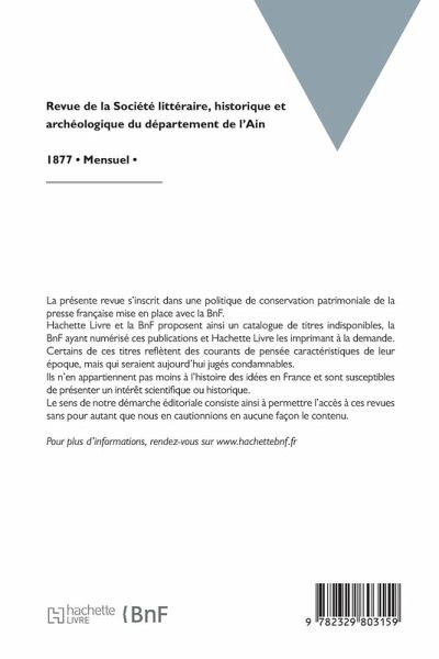 Revue de la Société littéraire, historique et archéologique du département de l'Ain Date de l'édition originale: 1877 La présente revue s'inscrit dans une politique de conservation patrimoniale de la presse française mise en place avec la BnF. Hachette Livre et la BnF proposent ainsi un catalogue de titres indisponibles, la BnF ayant numérisé ces publications et Hachette Livre les imprimant à la demande. Certains de ces titres reflètent des courants de pensée caractéristiques de leur époque, mais qui seraient aujourd'hui jugés condamnables. Ils n'en appartiennent pas moins à l'histoire des idées en France et sont susceptibles de présenter un intérêt scientifique ou historique. Le sens de notre démarche éditoriale consiste ainsi à permettre l'accès à ces revues sans pour autant que nous en cautionnions en aucune façon le contenu. Pour plus d'informations, rendez-vous sur www.hachettebnf.fr