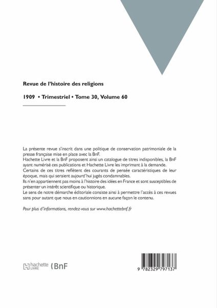 Revue de l'histoire des religions Date de l'édition originale: 1909 La présente revue s'inscrit dans une politique de conservation patrimoniale de la presse française mise en place avec la BnF. Hachette Livre et la BnF proposent ainsi un catalogue de titres indisponibles, la BnF ayant numérisé ces publications et Hachette Livre les imprimant à la demande. Certains de ces titres reflètent des courants de pensée caractéristiques de leur époque, mais qui seraient aujourd'hui jugés condamnables. Ils n'en appartiennent pas moins à l'histoire des idées en France et sont susceptibles de présenter un intérêt scientifique ou historique. Le sens de notre démarche éditoriale consiste ainsi à permettre l'accès à ces revues sans pour autant que nous en cautionnions en aucune façon le contenu. Pour plus d'informations, rendez-vous sur www.hachettebnf.fr