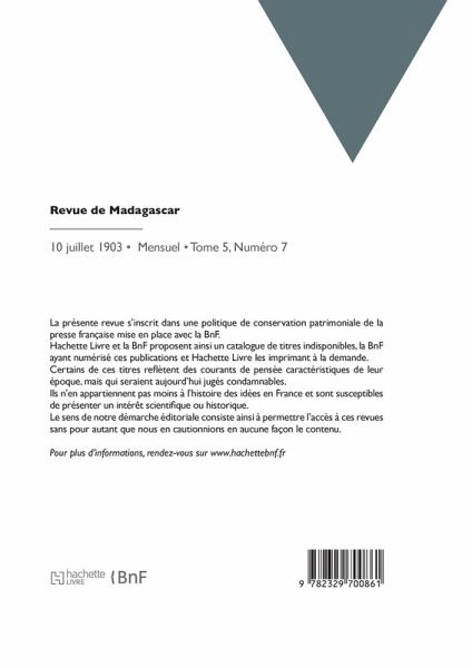 Revue de Madagascar: organe du Comité de Madagascar / directeur-gérant, C. Delhorbe Date de l'édition originale: 1903-07-10 La présente revue s'inscrit dans une politique de conservation patrimoniale de la presse française mise en place avec la BnF. Hachette Livre et la BnF proposent ainsi un catalogue de titres indisponibles, la BnF ayant numérisé ces publications et Hachette Livre les imprimant à la demande. Certains de ces titres reflètent des courants de pensée caractéristiques de leur époque, mais qui seraient aujourd'hui jugés condamnables. Ils n'en appartiennent pas moins à l'histoire des idées en France et sont susceptibles de présenter un intérêt scientifique ou historique. Le sens de notre démarche éditoriale consiste ainsi à permettre l'accès à ces revues sans pour autant que nous en cautionnions en aucune façon le contenu. Pour plus d'informations, rendez-vous sur www.hachettebnf.fr
