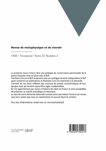 Revue de métaphysique et de morale Date de l'édition originale: 1930 La présente revue s'inscrit dans une politique de conservation patrimoniale de la presse française mise en place avec la BnF. Hachette Livre et la BnF proposent ainsi un catalogue de titres indisponibles, la BnF ayant numérisé ces publications et Hachette Livre les imprimant à la demande. Certains de ces titres reflètent des courants de pensée caractéristiques de leur époque, mais qui seraient aujourd'hui jugés condamnables. Ils n'en appartiennent pas moins à l'histoire des idées en France et sont susceptibles de présenter un intérêt scientifique ou historique. Le sens de notre démarche éditoriale consiste ainsi à permettre l'accès à ces revues sans pour autant que nous en cautionnions en aucune façon le contenu. Pour plus d'informations, rendez-vous sur www.hachettebnf.fr