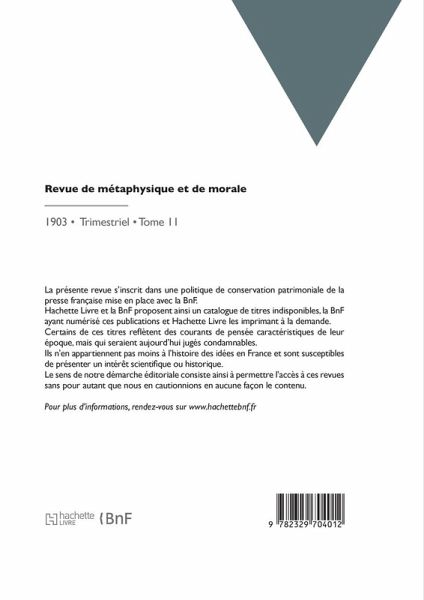 Revue de métaphysique et de morale Date de l'édition originale: 1903 La présente revue s'inscrit dans une politique de conservation patrimoniale de la presse française mise en place avec la BnF. Hachette Livre et la BnF proposent ainsi un catalogue de titres indisponibles, la BnF ayant numérisé ces publications et Hachette Livre les imprimant à la demande. Certains de ces titres reflètent des courants de pensée caractéristiques de leur époque, mais qui seraient aujourd'hui jugés condamnables. Ils n'en appartiennent pas moins à l'histoire des idées en France et sont susceptibles de présenter un intérêt scientifique ou historique. Le sens de notre démarche éditoriale consiste ainsi à permettre l'accès à ces revues sans pour autant que nous en cautionnions en aucune façon le contenu. Pour plus d'informations, rendez-vous sur www.hachettebnf.fr