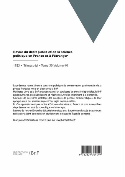 Revue du droit public et de la science politique en France et à l'étranger / dir. Gaston Jèze Date de l'édition originale: 1923 La présente revue s'inscrit dans une politique de conservation patrimoniale de la presse française mise en place avec la BnF. Hachette Livre et la BnF proposent ainsi un catalogue de titres indisponibles, la BnF ayant numérisé ces publications et Hachette Livre les imprimant à la demande. Certains de ces titres reflètent des courants de pensée caractéristiques de leur époque, mais qui seraient aujourd'hui jugés condamnables. Ils n'en appartiennent pas moins à l'histoire des idées en France et sont susceptibles de présenter un intérêt scientifique ou historique. Le sens de notre démarche éditoriale consiste ainsi à permettre l'accès à ces revues sans pour autant que nous en cautionnions en aucune façon le contenu. Pour plus d'informations, rendez-vous sur www.hachettebnf.fr