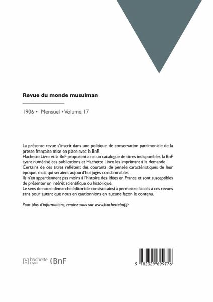 Revue du monde musulman Date de l'édition originale: 1906 La présente revue s'inscrit dans une politique de conservation patrimoniale de la presse française mise en place avec la BnF. Hachette Livre et la BnF proposent ainsi un catalogue de titres indisponibles, la BnF ayant numérisé ces publications et Hachette Livre les imprimant à la demande. Certains de ces titres reflètent des courants de pensée caractéristiques de leur époque, mais qui seraient aujourd'hui jugés condamnables. Ils n'en appartiennent pas moins à l'histoire des idées en France et sont susceptibles de présenter un intérêt scientifique ou historique. Le sens de notre démarche éditoriale consiste ainsi à permettre l'accès à ces revues sans pour autant que nous en cautionnions en aucune façon le contenu. Pour plus d'informations, rendez-vous sur www.hachettebnf.fr