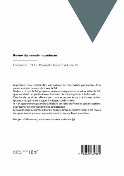Revue du monde musulman Date de l'édition originale: 1913-12 La présente revue s'inscrit dans une politique de conservation patrimoniale de la presse française mise en place avec la BnF. Hachette Livre et la BnF proposent ainsi un catalogue de titres indisponibles, la BnF ayant numérisé ces publications et Hachette Livre les imprimant à la demande. Certains de ces titres reflètent des courants de pensée caractéristiques de leur époque, mais qui seraient aujourd'hui jugés condamnables. Ils n'en appartiennent pas moins à l'histoire des idées en France et sont susceptibles de présenter un intérêt scientifique ou historique. Le sens de notre démarche éditoriale consiste ainsi à permettre l'accès à ces revues sans pour autant que nous en cautionnions en aucune façon le contenu. Pour plus d'informations, rendez-vous sur www.hachettebnf.fr