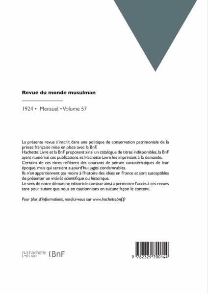 Revue du monde musulman Date de l'édition originale: 1924 La présente revue s'inscrit dans une politique de conservation patrimoniale de la presse française mise en place avec la BnF. Hachette Livre et la BnF proposent ainsi un catalogue de titres indisponibles, la BnF ayant numérisé ces publications et Hachette Livre les imprimant à la demande. Certains de ces titres reflètent des courants de pensée caractéristiques de leur époque, mais qui seraient aujourd'hui jugés condamnables. Ils n'en appartiennent pas moins à l'histoire des idées en France et sont susceptibles de présenter un intérêt scientifique ou historique. Le sens de notre démarche éditoriale consiste ainsi à permettre l'accès à ces revues sans pour autant que nous en cautionnions en aucune façon le contenu. Pour plus d'informations, rendez-vous sur www.hachettebnf.fr