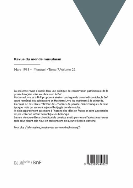 Revue du monde musulman Date de l'édition originale: 1913-03 La présente revue s'inscrit dans une politique de conservation patrimoniale de la presse française mise en place avec la BnF. Hachette Livre et la BnF proposent ainsi un catalogue de titres indisponibles, la BnF ayant numérisé ces publications et Hachette Livre les imprimant à la demande. Certains de ces titres reflètent des courants de pensée caractéristiques de leur époque, mais qui seraient aujourd'hui jugés condamnables. Ils n'en appartiennent pas moins à l'histoire des idées en France et sont susceptibles de présenter un intérêt scientifique ou historique. Le sens de notre démarche éditoriale consiste ainsi à permettre l'accès à ces revues sans pour autant que nous en cautionnions en aucune façon le contenu. Pour plus d'informations, rendez-vous sur www.hachettebnf.fr