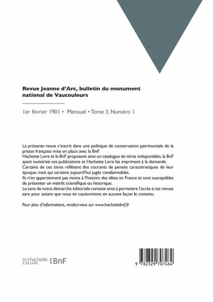 Revue Jeanne d'Arc: bulletin du monument national de Vaucouleurs / directeur Charles-Emile Montet Date de l'édition originale: 1901-02-01 La présente revue s'inscrit dans une politique de conservation patrimoniale de la presse française mise en place avec la BnF. Hachette Livre et la BnF proposent ainsi un catalogue de titres indisponibles, la BnF ayant numérisé ces publications et Hachette Livre les imprimant à la demande. Certains de ces titres reflètent des courants de pensée caractéristiques de leur époque, mais qui seraient aujourd'hui jugés condamnables. Ils n'en appartiennent pas moins à l'histoire des idées en France et sont susceptibles de présenter un intérêt scientifique ou historique. Le sens de notre démarche éditoriale consiste ainsi à permettre l'accès à ces revues sans pour autant que nous en cautionnions en aucune façon le contenu. Pour plus d'informations, rendez-vous sur www.hachettebnf.fr