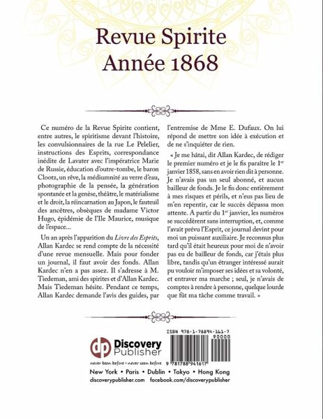 Ce numéro de la Revue Spirite contient, entre autres, le spiritisme devant l'histoire, les convulsionnaires de la rue Le Pelelier, instructions des Esprits, correspondance inédite de Lavater avec l'impératrice Marie de Russie, éducation d'outre-tombe, le baron Clootz, un rêve, la médiumnité au verre d'eau, photographie de la pensée, la génération spontanée et la genèse, théâtre, le matérialisme et le droit, la réincarnation au Japon, le fauteuil des ancêtres, obsèques de madame Victor Hugo, épidémie de l'Ile Maurice, musique de l'espace... Un an après l’apparition du Livre des Esprits, Allan Kardec se rend compte de la nécessité d’une revue mensuelle. Mais pour fonder un journal, il faut avoir des fonds. Allan Kardec n’en a pas assez. Il s’adresse à M. Tiedeman, ami des spirites et d’Allan Kardec. Mais Tiedeman hésite. Pendant ce temps, Allan Kardec demande l’avis des guides, par l’entremise de Mme E. Dufaux. On lui répond de mettre son idée à exécution et de ne s’inquiéter de rien. « Je me hâtai, dit Allan Kardec, de rédiger le premier numéro et je le fis paraître le 1er janvier 1858, sans en avoir rien dit à personne. Je n’avais pas un seul abonné, et aucun bailleur de fonds. Je le fis donc entièrement à mes risques et périls, et n’eus pas lieu de m’en repentir, car le succès dépassa mon attente. A partir du 1er janvier, les numéros se succédèrent sans interruption, et, comme l’avait prévu l’Esprit, ce journal devint pour moi un puissant auxiliaire. Je reconnus plus tard qu’il était heureux pour moi de n’avoir pas eu de bailleur de fonds, car j’étais plus libre, tandis qu’un étranger intéressé aurait pu vouloir m’imposer ses idées et sa volonté, et entraver ma marche ; seul, je n’avais de comptes à rendre à personne, quelque lourde que fût ma tâche comme travail. » Note de l'éditeur : Afin d'être plus agréable lors de la lecture, cet ouvrage est conforme au format classique d'une revue scientifique. Toutes nos publications font l'objet d'un travail soigné tant au niveau typographique qu'au niveau du design.