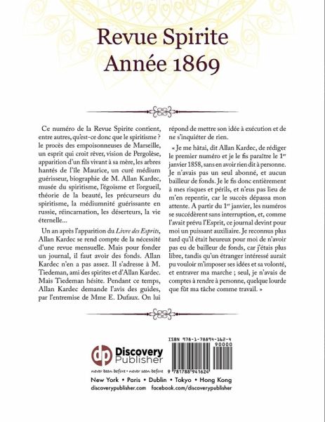 Ce numéro de la Revue Spirite contient, entre autres, qu'est-ce donc que le spiritisme ? le procès des empoisonneuses de Marseille, un esprit qui croit rêvr, vision de Pergolèse, apparition d'un fils vivant à sa mère, les arbres hantés de l'ile Maurince, un curé médium guérisseur, biographie de M. Allan Kardec, musée du spiritisme, l'égoïsme et l'orgueil, théorie de la beauté, les précurseurs du spiritisme, la médiumnité guérissante en russie, réincarnation, les déserteurs, la vie éternelle... Un an après l’apparition du Livre des Esprits, Allan Kardec se rend compte de la nécessité d’une revue mensuelle. Mais pour fonder un journal, il faut avoir des fonds. Allan Kardec n’en a pas assez. Il s’adresse à M. Tiedeman, ami des spirites et d’Allan Kardec. Mais Tiedeman hésite. Pendant ce temps, Allan Kardec demande l’avis des guides, par l’entremise de Mme E. Dufaux. On lui répond de mettre son idée à exécution et de ne s’inquiéter de rien. « Je me hâtai, dit Allan Kardec, de rédiger le premier numéro et je le fis paraître le 1er janvier 1858, sans en avoir rien dit à personne. Je n’avais pas un seul abonné, et aucun bailleur de fonds. Je le fis donc entièrement à mes risques et périls, et n’eus pas lieu de m’en repentir, car le succès dépassa mon attente. A partir du 1er janvier, les numéros se succédèrent sans interruption, et, comme l’avait prévu l’Esprit, ce journal devint pour moi un puissant auxiliaire. Je reconnus plus tard qu’il était heureux pour moi de n’avoir pas eu de bailleur de fonds, car j’étais plus libre, tandis qu’un étranger intéressé aurait pu vouloir m’imposer ses idées et sa volonté, et entraver ma marche ; seul, je n’avais de comptes à rendre à personne, quelque lourde que fût ma tâche comme travail. » Note de l'éditeur : Afin d'être plus agréable lors de la lecture, cet ouvrage est conforme au format classique d'une revue scientifique. Toutes nos publications font l'objet d'un travail soigné tant au niveau typographique qu'au niveau du design.