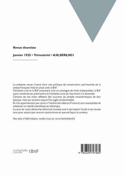 Revue thomiste: questions du temps présent Date de l'édition originale: 1925-01 La présente revue s'inscrit dans une politique de conservation patrimoniale de la presse française mise en place avec la BnF. Hachette Livre et la BnF proposent ainsi un catalogue de titres indisponibles, la BnF ayant numérisé ces publications et Hachette Livre les imprimant à la demande. Certains de ces titres reflètent des courants de pensée caractéristiques de leur époque, mais qui seraient aujourd'hui jugés condamnables. Ils n'en appartiennent pas moins à l'histoire des idées en France et sont susceptibles de présenter un intérêt scientifique ou historique. Le sens de notre démarche éditoriale consiste ainsi à permettre l'accès à ces revues sans pour autant que nous en cautionnions en aucune façon le contenu. Pour plus d'informations, rendez-vous sur www.hachettebnf.fr