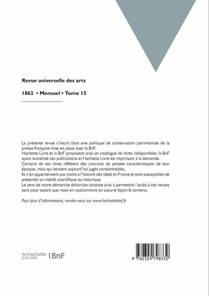 Revue universelle des arts / publiée par M. Paul Lacroix (Bibliophile Jacob) Date de l'édition originale: 1862 La présente revue s'inscrit dans une politique de conservation patrimoniale de la presse française mise en place avec la BnF. Hachette Livre et la BnF proposent ainsi un catalogue de titres indisponibles, la BnF ayant numérisé ces publications et Hachette Livre les imprimant à la demande. Certains de ces titres reflètent des courants de pensée caractéristiques de leur époque, mais qui seraient aujourd'hui jugés condamnables. Ils n'en appartiennent pas moins à l'histoire des idées en France et sont susceptibles de présenter un intérêt scientifique ou historique. Le sens de notre démarche éditoriale consiste ainsi à permettre l'accès à ces revues sans pour autant que nous en cautionnions en aucune façon le contenu. Pour plus d'informations, rendez-vous sur www.hachettebnf.fr